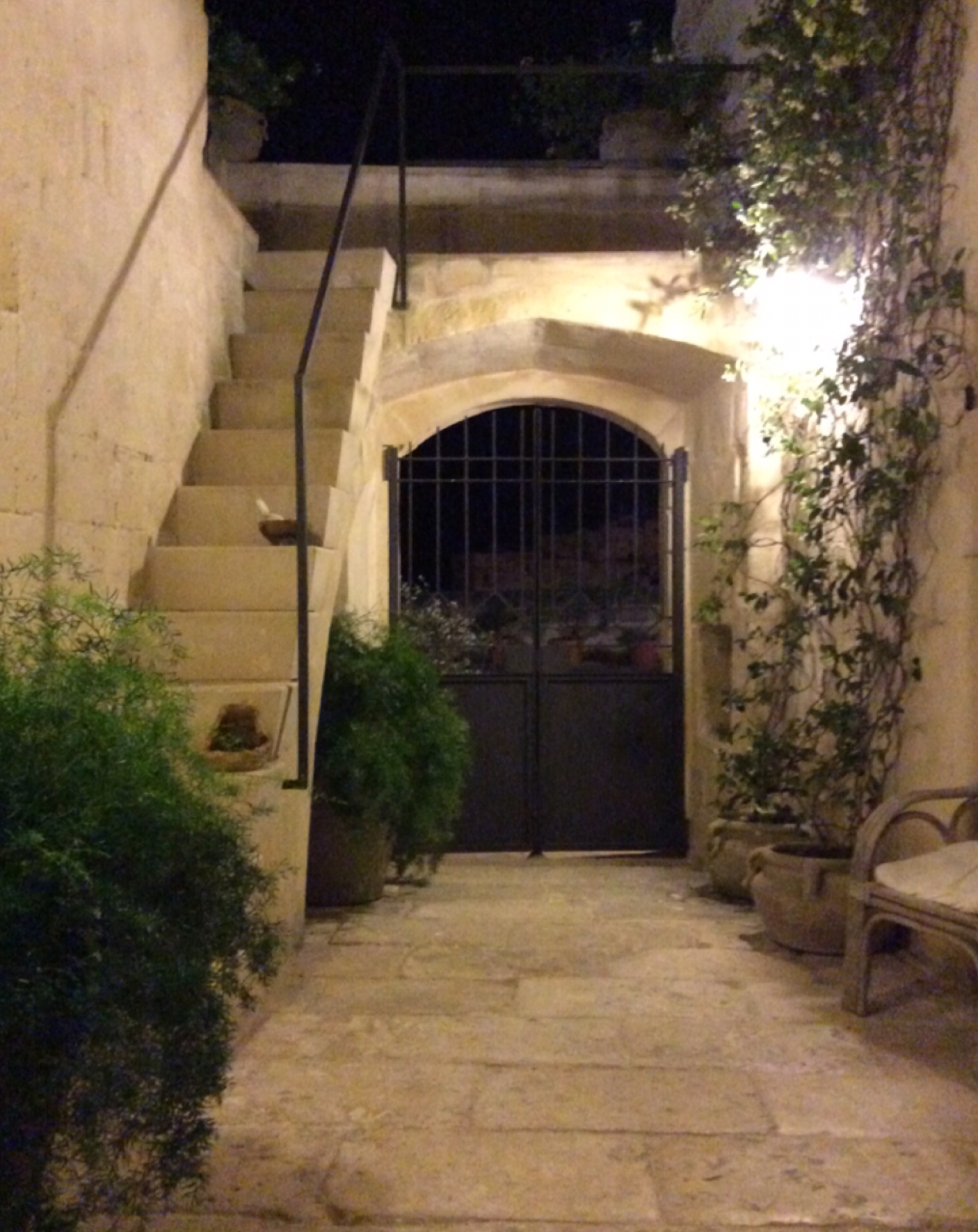 I balconi del palazzo, così come il cortile, si affacciano direttamente sui sassi e godono di una vista che si apre direttamente sul Sasso Barisano, sulla gravina e sulla cattedrale.